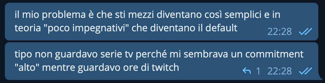 Like, I didn’t watch TV series because it appeared “high” commitment, but I watched Twitch for hours.