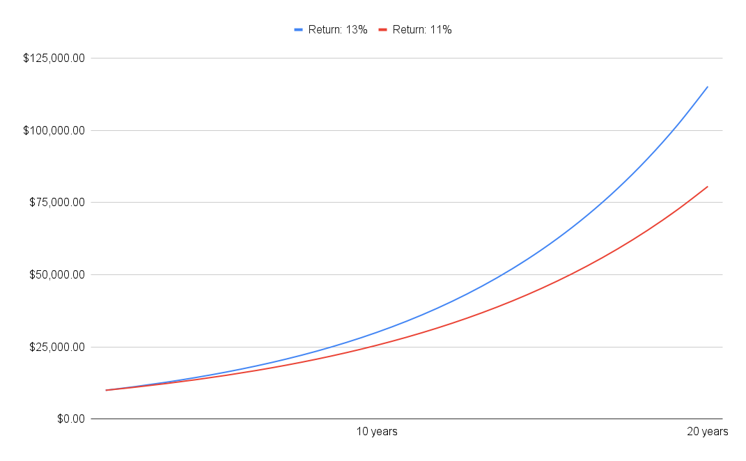 Now let’s say we invested the same amount of money in an active fund with the same total return, but with a 2% annual fee. The net return would then be 11%. After 10 years, we end up with about $28,000. We lost $6.000 because of the commission.